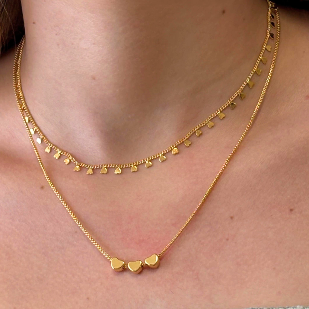 Duplo Coração Trio é o colar perfeito para quem busca delicadeza e sofisticação. Com dois fios finos adornados por pequenos corações, ele traz um toque romântico e elegante a qualquer look. Ideal para ocasiões especiais ou para o dia a dia, este colar duplo com corações pequenos valoriza sua beleza com sutileza e charme. Um acessório indispensável para quem ama estilo e elegância.
